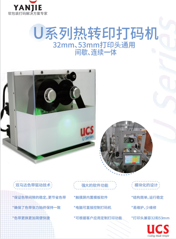 詳細信息 訂貨號U32i-T 品牌YANJIE 貨號U32i-T 型號U32i-T 最高分辨率300(dpi) 打印介質塑料膜、塑料預制袋 打印尺寸53mm*180mm 顏色等級1(級) 接口USB接口 支持存儲卡SD/SDHC卡 外形尺寸210*200*180(mm) 規格32mm U系列熱轉印打碼機打印面積可達53mm x 180mm,可以將產品配料表和營養成分表及各種復雜信息打印在產品軟包裝上,幫助客戶節省印刷成本,同時降低包裝膜的浪費。