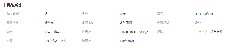 30格電烘干機 JMH-E30 尺寸: 215 ×110 ×190CM, 功率: 12KW, 容積: 2.9立方, ,篩網尺寸:100*80CM, 裝入量:300-400KG , 風機配置:370W *2個, 180W*1個,三相四線。 60格電烘干機 JMH-E60 尺寸: 246 ×175 ×196CM,功率: 24KW,容積: 5.8立方, ,篩網尺寸: 100*80CM, 裝入量:600-800KG ,風機配置:250W *4個, 180W*2個 ,三相四線。