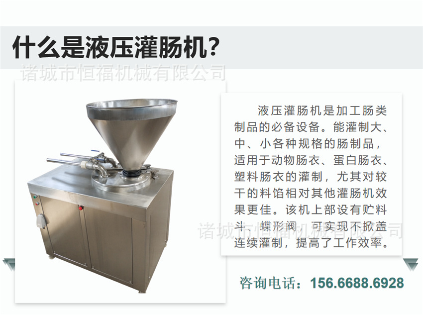 本公司主要供應灌腸全套生產設備,其中液壓灌腸機是灌腸設備中很重要的組成部份,設備不止一個型號,如果您想從事腸類的生產,想咨詢設備,不妨咨詢本公司銷售客服,我們可以根據您的情況為您定制適合您有和的設備。TEL:156-6688-6928.