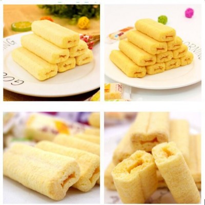 膨化夾心卷生產技術(也稱雙擠壓技術),是利用先進的擠壓膨化技術在單螺桿或雙螺桿設備上以大米、玉米或其它谷物為原料,用純奶油做介質,將蛋黃粉、奶粉、糖粉、芝麻醬,巧克力粉等原料進行稀釋,配成夾心料,在膨化物擠出的同時將夾心料注入膨化谷物食品內,經過加工制成一種夾心小食品,該食品口感酥脆,風味獨特,還可根據不同的工藝,不同的配方加工成各種營養食品、療效食品、功能食品等,為膨化技術在食品加工中的應用提供了一種新的途徑。